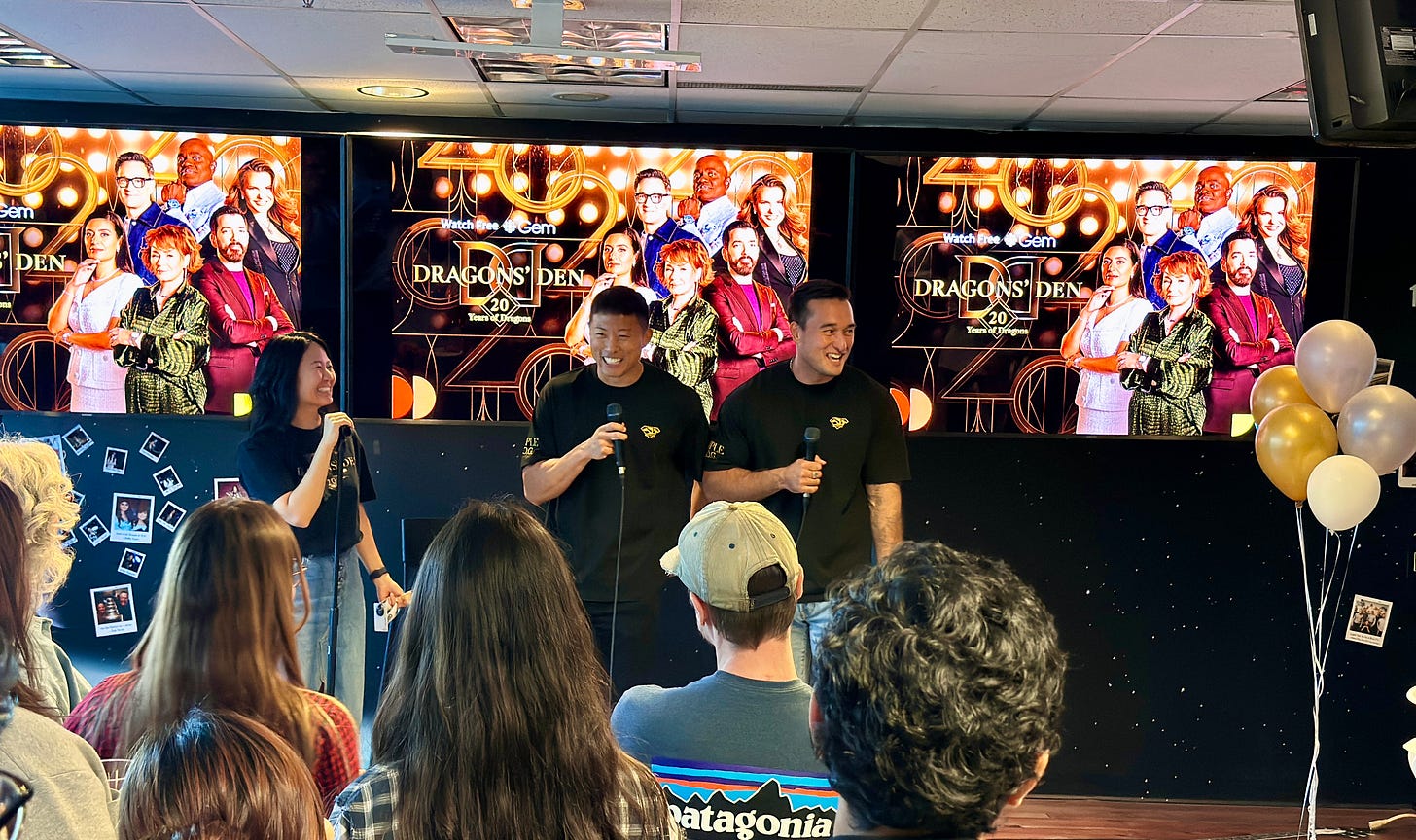 One weekend, they were working separate events. At both, different people told them the same thing: they should audition for Dragons’ Den. They hadn’t even considered it—they didn’t know the team was in Vancouver—but after enough encouragement, they decided to give it a try. The duo had only 10 minutes to prepare to make it in time. They practiced in the car and even had to buy their own product from a store before walking in.