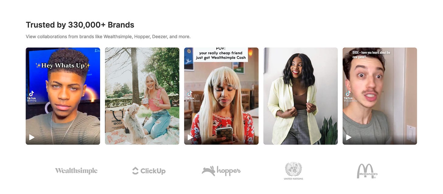 “On that side, you don’t need a ton at the start to kick off,” shares Rannard. “Because one brand can service up to 10 creators or more. […] It’s unlike other marketplaces, [like] Airbnb. One rental can service one person at a time. But one brand can service multiple creators.”